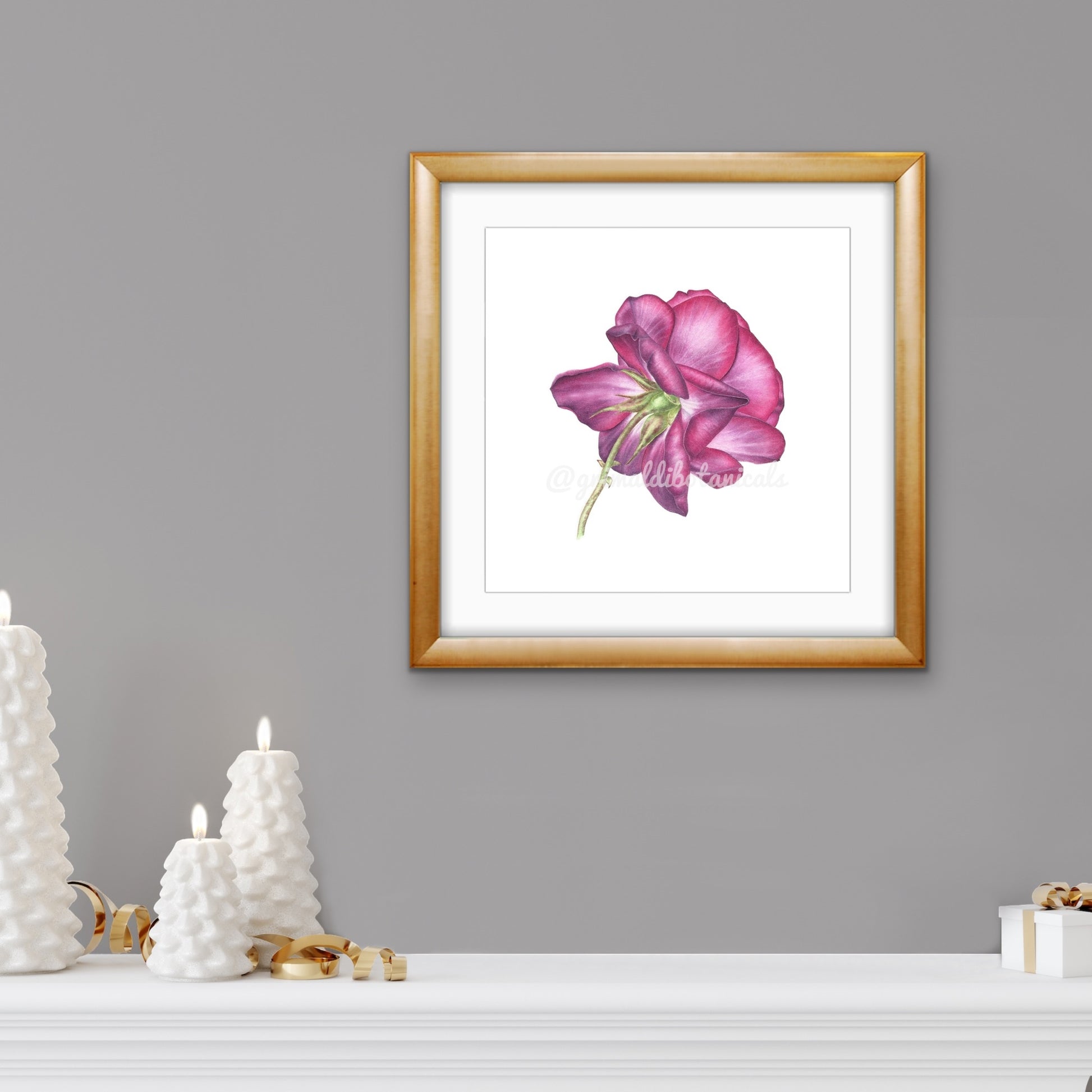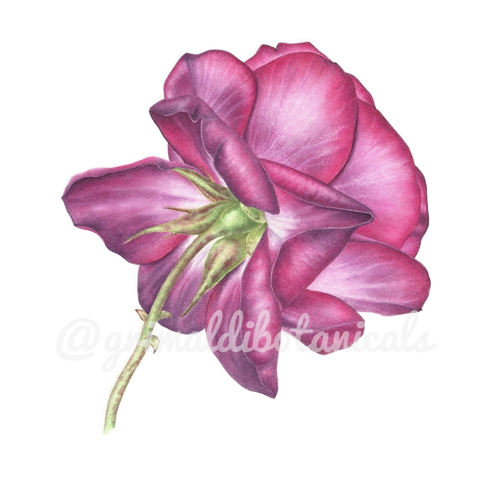This fine art print highlights the unique perspective of the Back of the Rose, featuring the beautiful ‘Wild Blue Yonder’ rose. The vibrant petals in dark red, purple, and lavender are elegantly depicted from the reverse side, showcasing their intricate folds and shading. Against a clean white background, the detailed green stem adds a graceful balance to the composition.