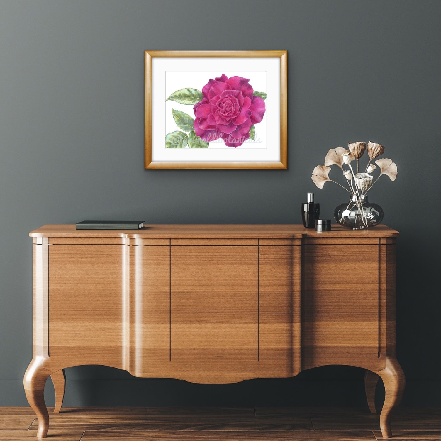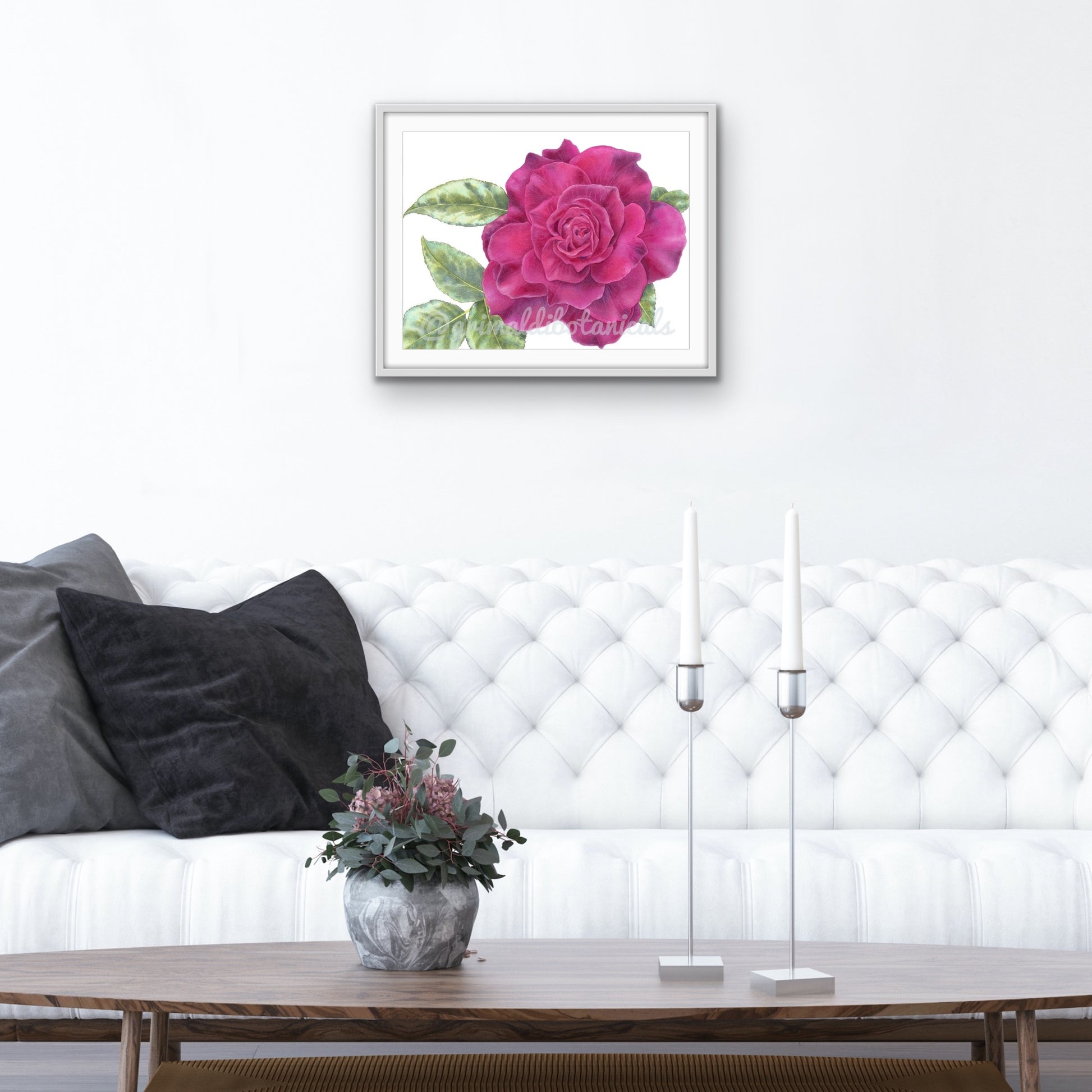 This captivating fine art print showcases a vibrant purple rose, rendered with exquisite detail. Rich, velvety petals are beautifully contrasted with the shine of the leaves, capturing the essence of this stunning flower.